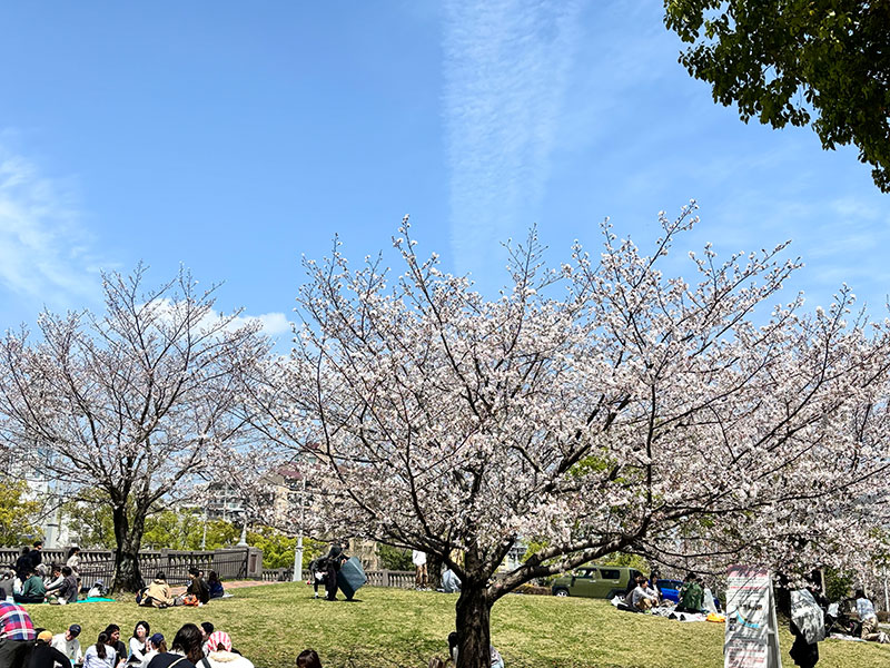 高麗橋のたもとはお花見のお客様でいっぱい。