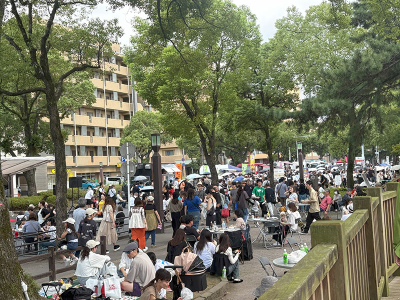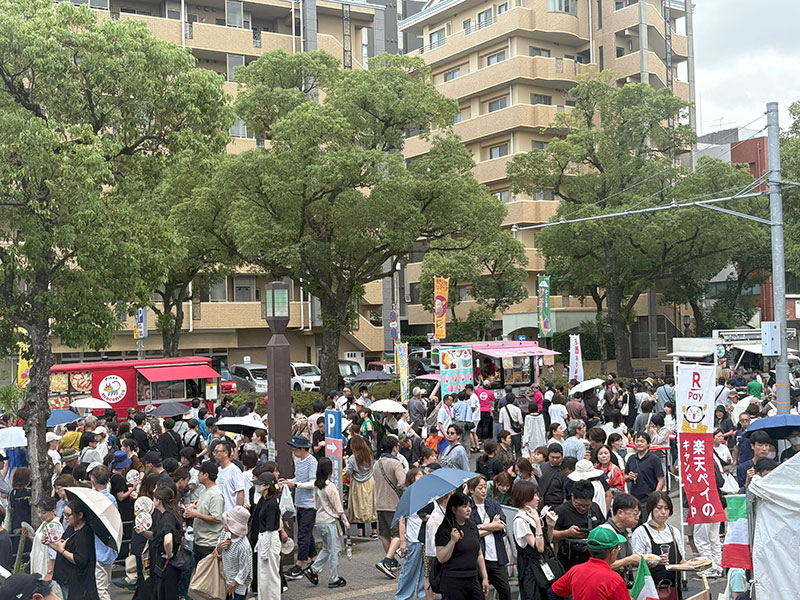 当日はナポリ通りの片側三車線が歩行者天国となり、大にぎわいでした。ワイングラス片手に川沿いの遊歩道を歩いたり、ピザやパスタに舌鼓を打ったり、イタリアンな雰囲気の中で、みなさん楽しそうでした。